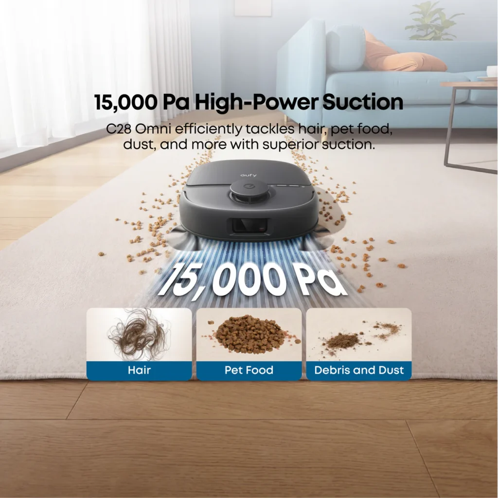The Omni C28 is equipped with 15,000 Pa of suction, which places it firmly in the upper tier of mid‑range robot vacuums. In real‑world use, this translates to strong debris pickup on hard floors and surprisingly capable carpet cleaning. The robot automatically adjusts suction when it detects carpet, ramping up power to pull dirt from fibers more effectively.